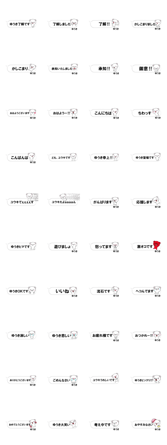 ゆうき、勇気、優樹、祐樹、など名前が「ユウキ」の方が使えるスタンプです。吹き出しで日常会話が使えます。