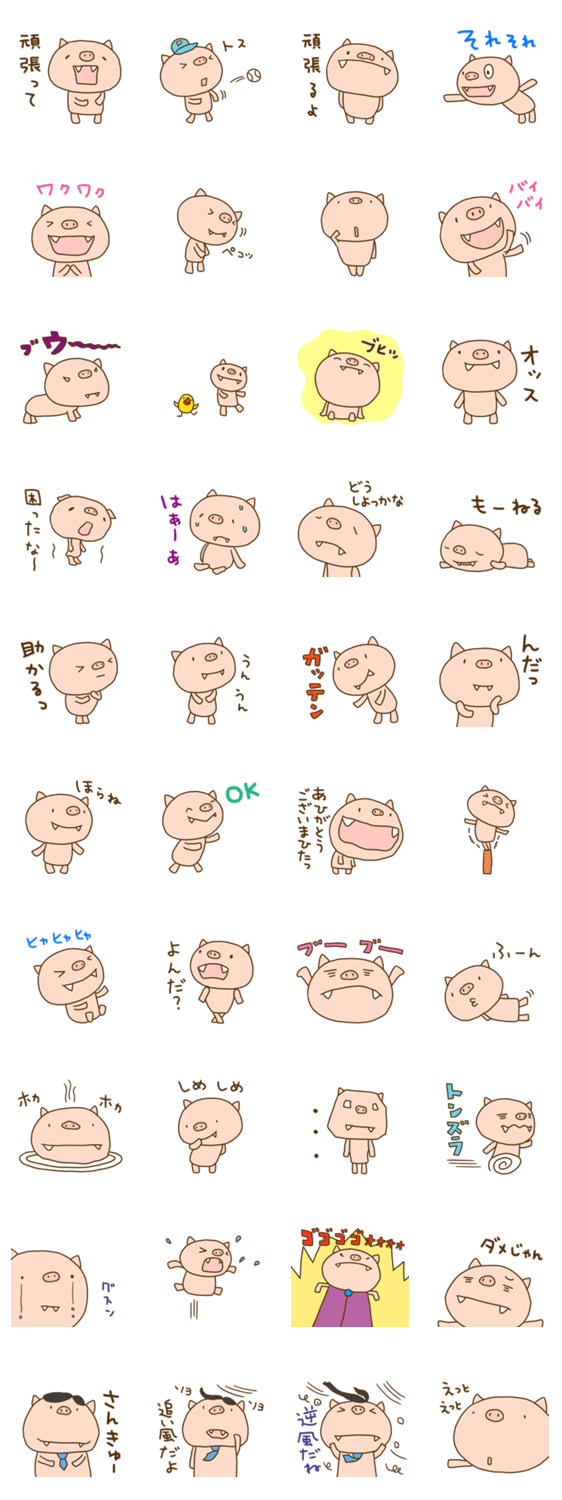 | スタンプ説明 | 「オラ、キバブタ。」 キバがチャームポイントの素朴で純粋な子ぶたです。 いつでもどこでも自然体。 日常の連絡などに。 |