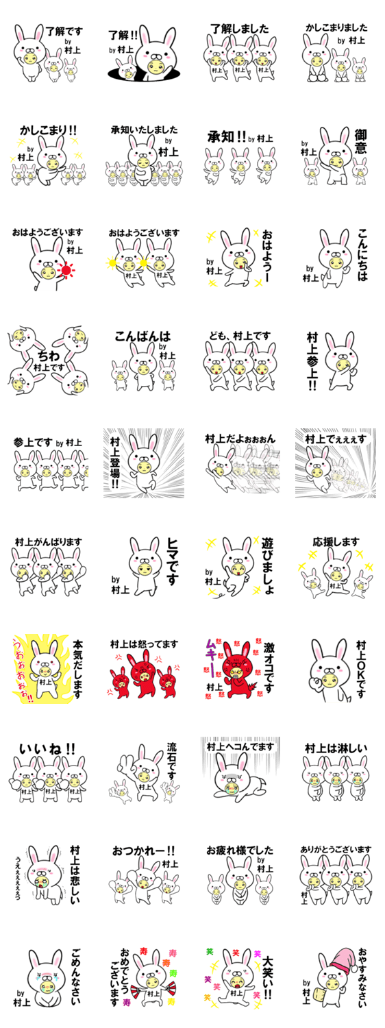 村上(むらかみ、ムラカミ)さん用のスタンプで、うさぎの全身タイツを着ています。日常会話で使えます。