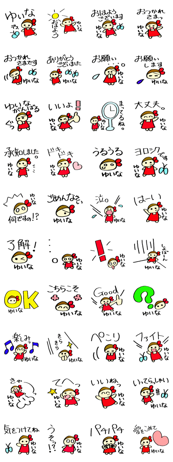 結奈、結菜、結愛、由奈、唯奈、結花・・ゆいなちゃん、さんの名前スタンプ。赤いリボンとワンピースの小さな女の子です。よく使われる言葉は友達用と敬語で。