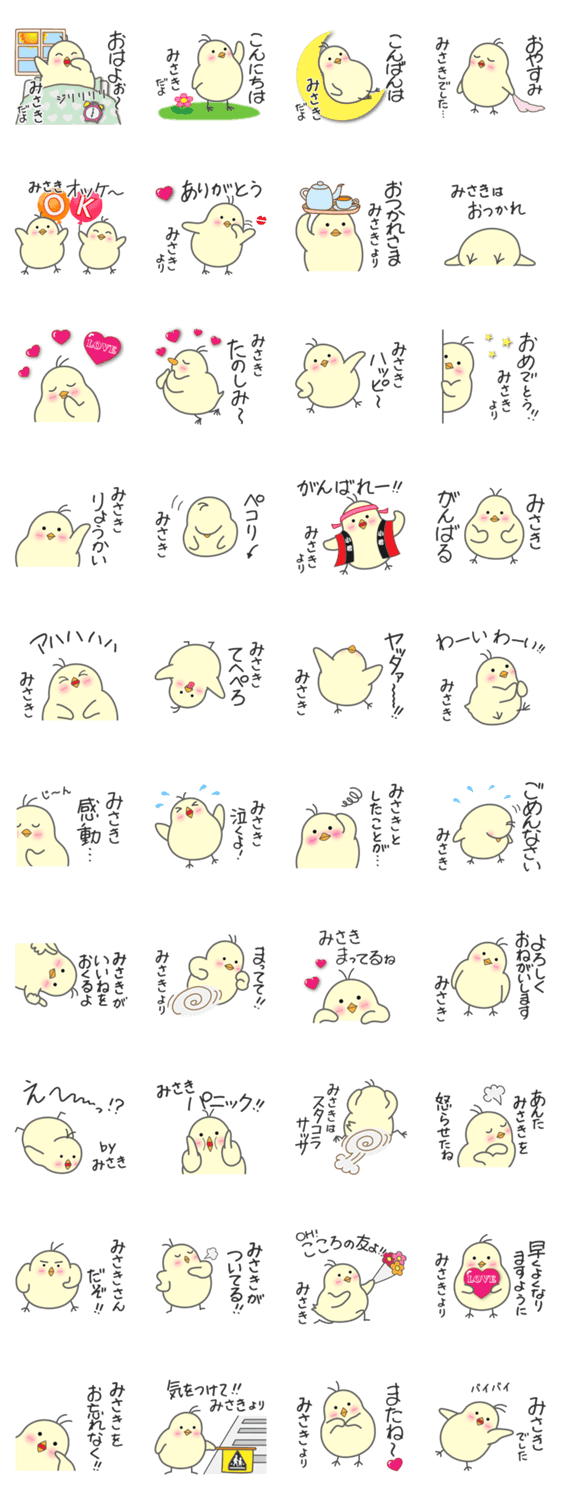 | スタンプ説明 | 【みさき】さん専用スタンプです。可愛いヒヨコが日常生活でよく使うフレーズや相づちを、忙しいあなたの代わりにつぶやきます。(by マサユミ) |