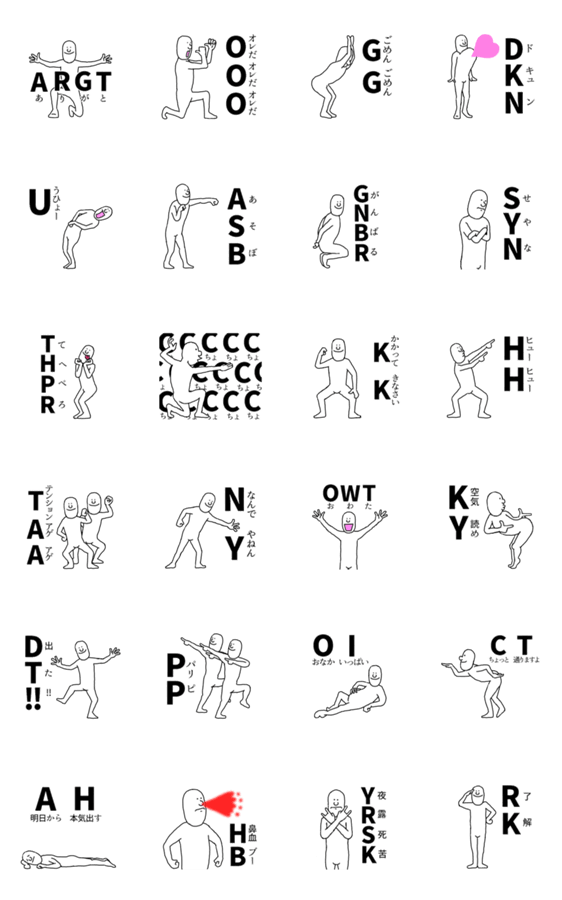トークのセリフをアルファベットで略したスタンプです。第二弾です。動きます。アルファベットの下の略す前のセリフを表示してます。略したダイゴミをお楽しみください。