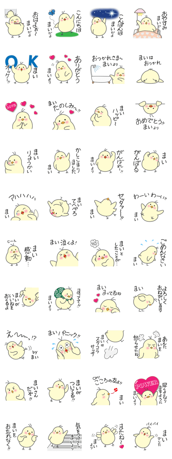 | スタンプ説明 | 【まい】さん専用スタンプです。可愛いヒヨコが日常生活でよく使うフレーズや相づちを、忙しいあなたの代わりにつぶやきます。(by マサユミ) |