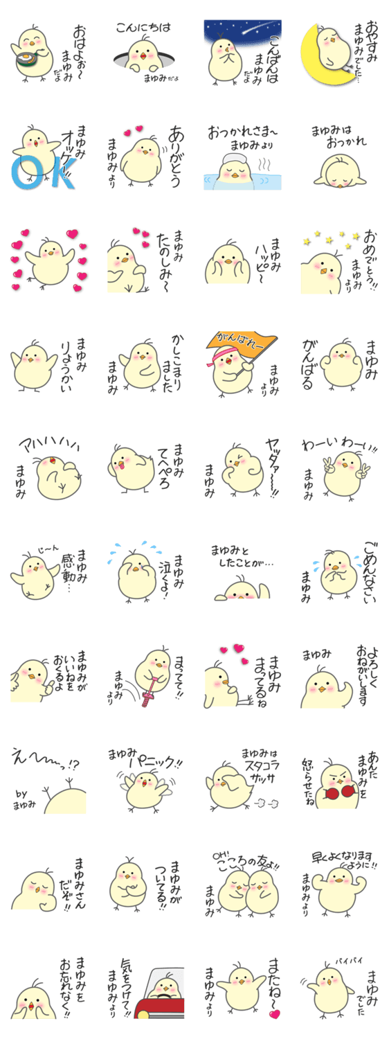 | スタンプ説明 | 【まゆみ】さん専用スタンプです。可愛いヒヨコが日常生活でよく使うフレーズや相づちを、忙しいあなたの代わりにつぶやきます。(by マサユミ) |
