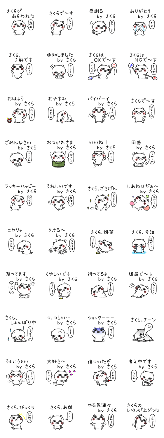 桜、咲良、朔良、櫻…、全国の「サクラ」さん専用の猫キャラ名前スタンプです。日常会話の基本セットです。「ちゃんねこシリーズ」です。