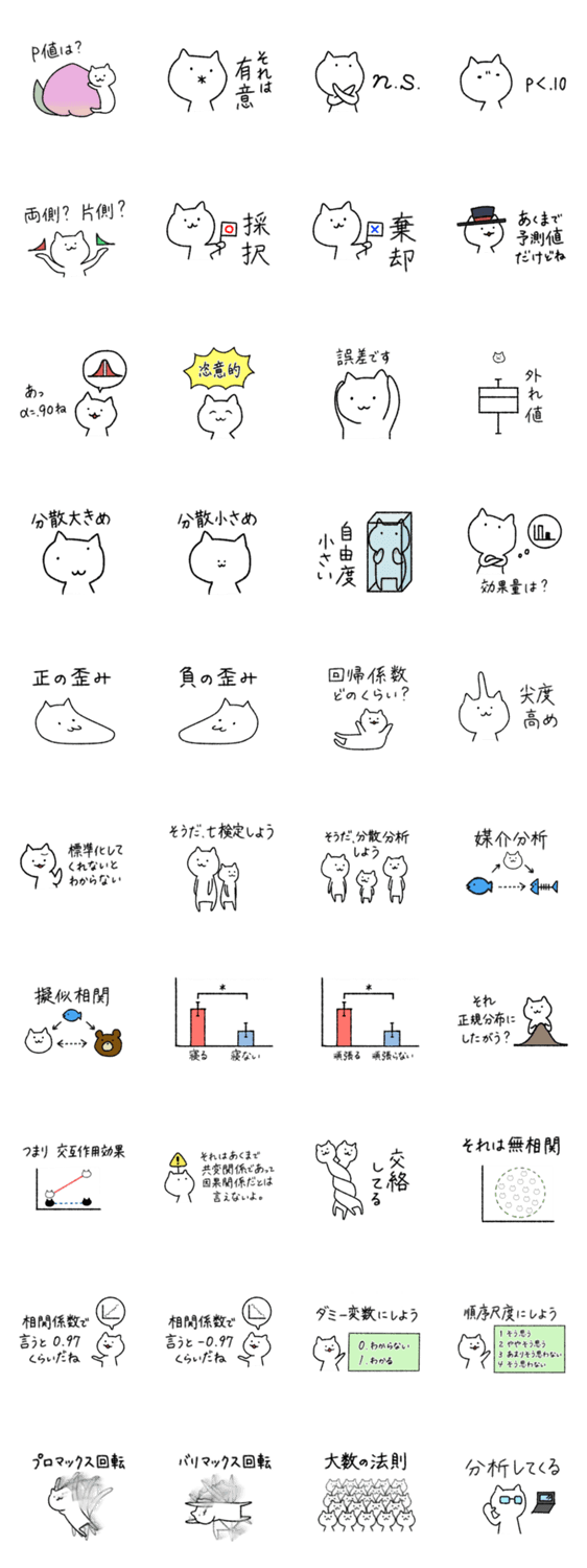 統計を使う人による統計を使う人のためのスタンプです。日常で使えそう(?)な表現をネコとともにお届けします。