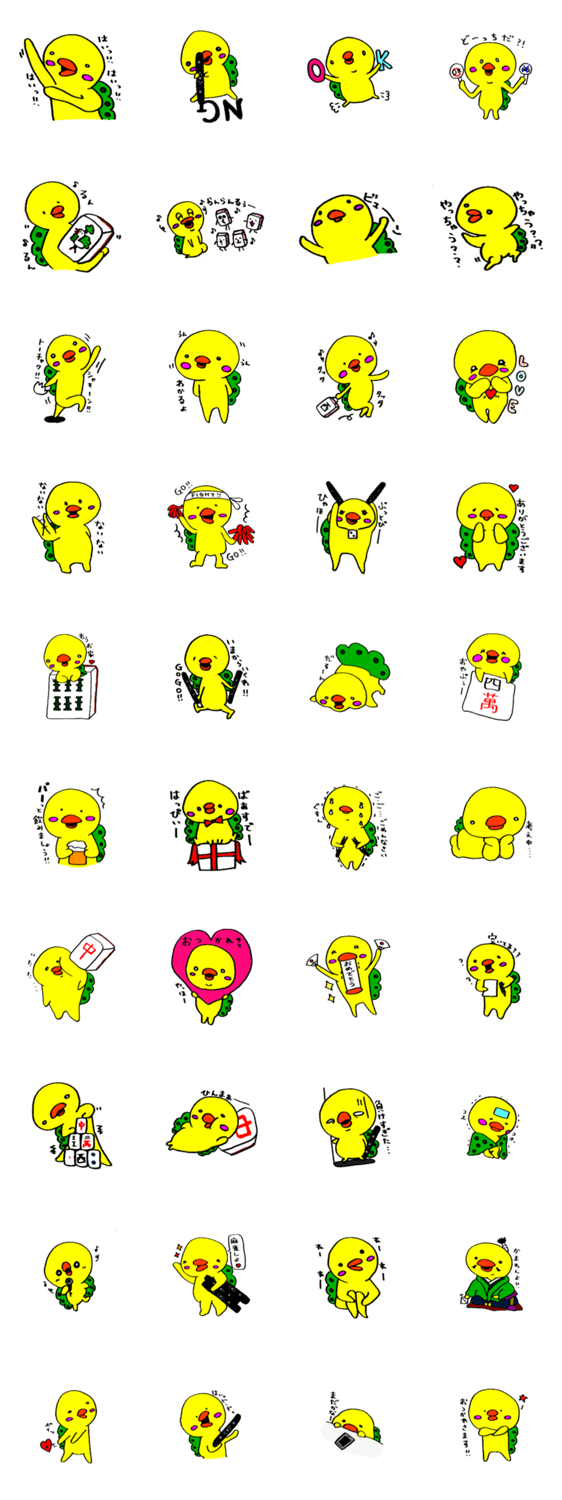 | スタンプ説明 | 麻雀のイーソウちゃん(ヒヨコ?孔雀?)による日常スタンプ。by.なお |