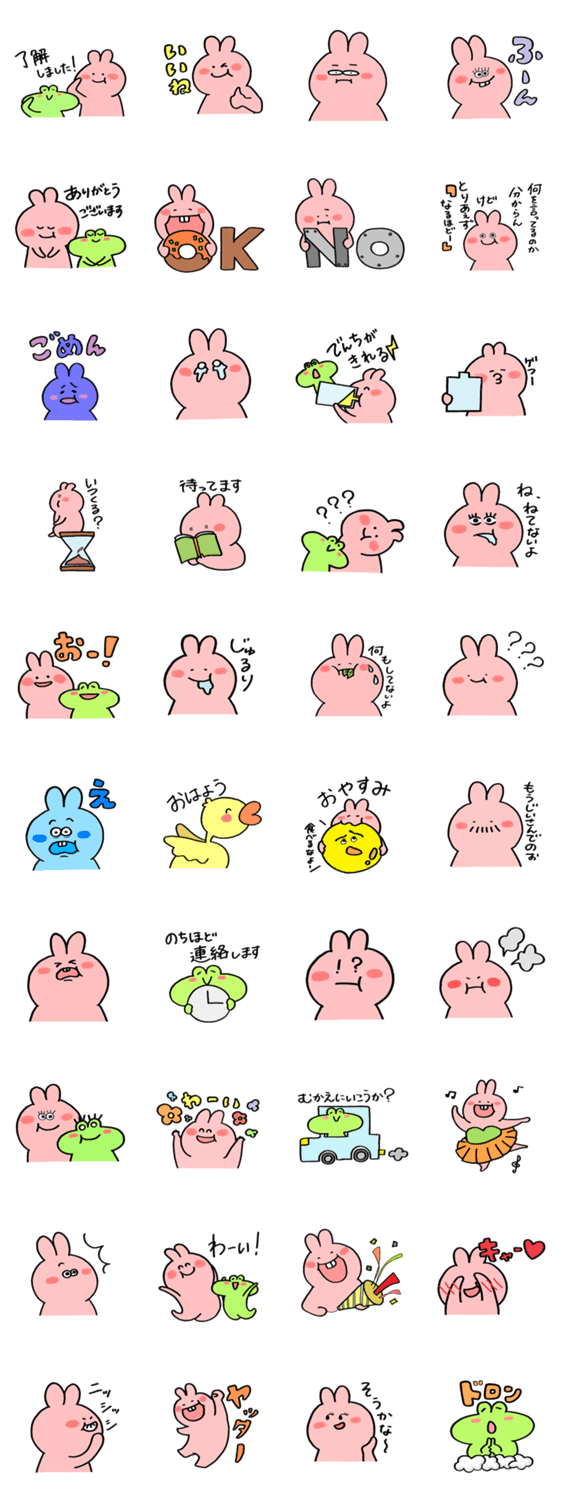 食いしん坊なうさぎとやさしいカエルのスタンプです。ときどきとりもでてくるかも…。