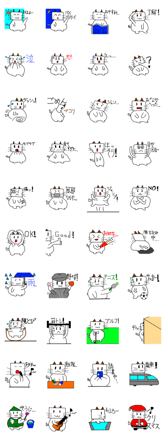 顔は四角餅、体は丸餅のもちっとした?猫です。日常生活の挨拶や気持ちなど、色々な状況や場面で使えると思います。