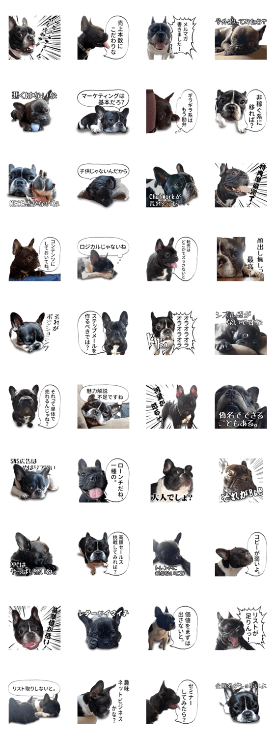 フレンチブルドッグのバムとやめぴが様々なものごとに突っ込むスタンプ。ネットビジネス用語でまとめてみました。