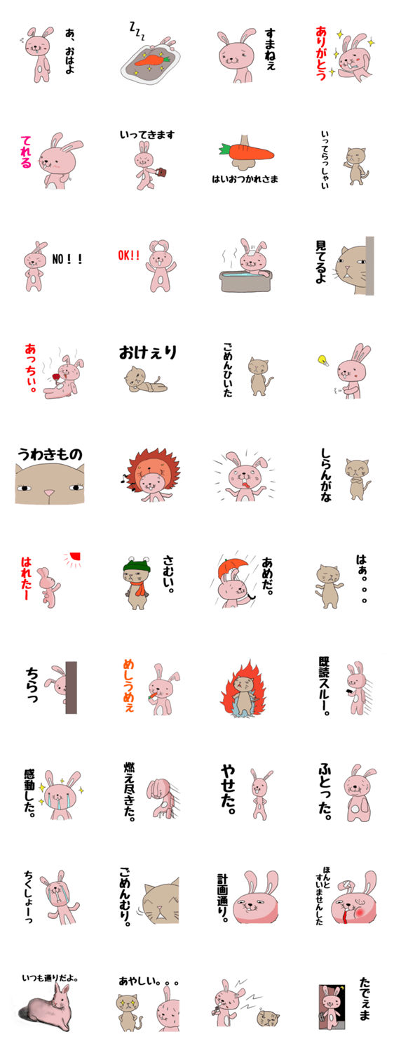 間抜けなうさぎと生意気な猫のスタンプ。