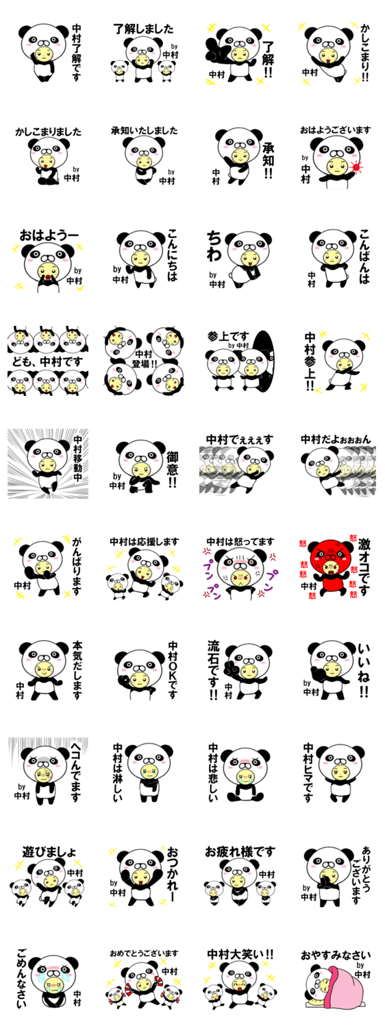 中村(なかむら、ナカムラ)さん用のスタンプで、パンダの全身タイツを着ています。日常会話で使えます。