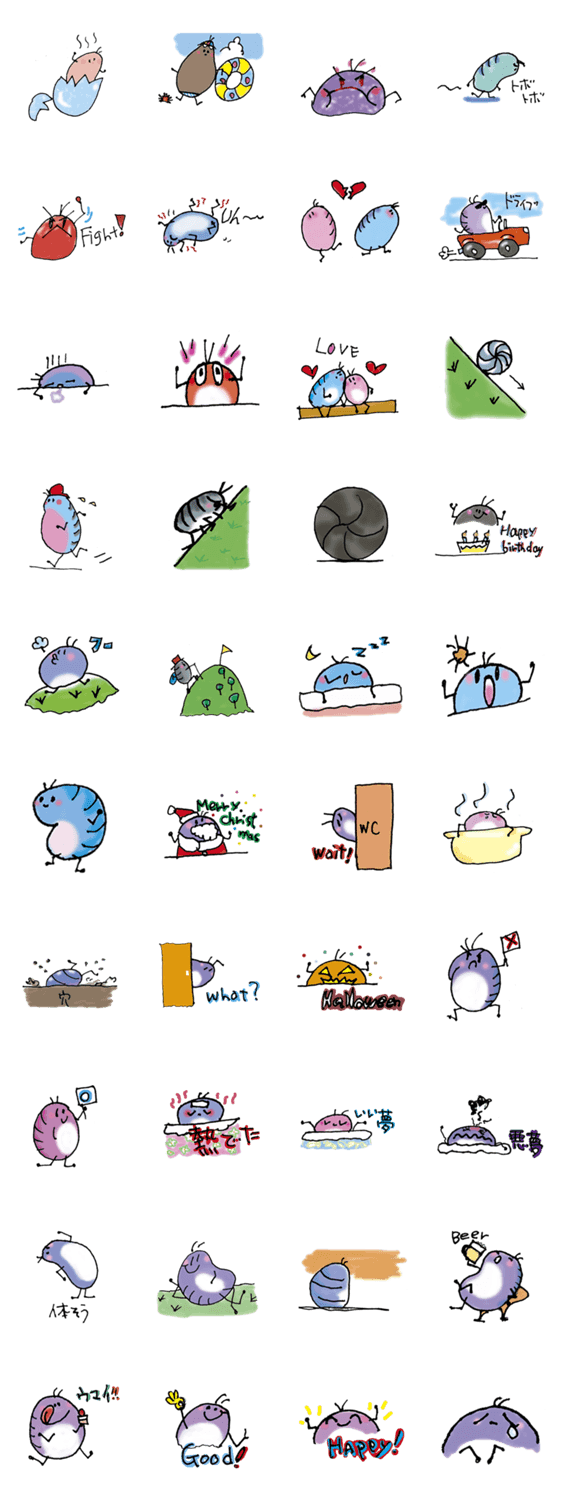 時々閉じこもりがちなダンゴ虫くんですがやがて復活し、海や山へとレジャーにも出かけます。飲んで食べてイベントも大好き。はしゃぎすぎたら又閉じこもり反省します。