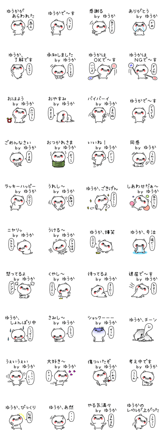 優香、佑香、裕香、夕香、優花…、全国の「ユウカ」さん専用の猫キャラ名前スタンプです。日常会話の基本セットです。「ちゃんねこシリーズ」です。