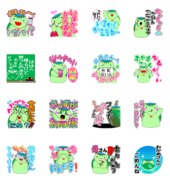 おかあさん限定で送るスタンプ16個入りです。帰り際にちょこっと、おねだりにちょこっと、言いにくい「ごめんね」もちょこっと。 おかあさんが口癖の父もオケ?