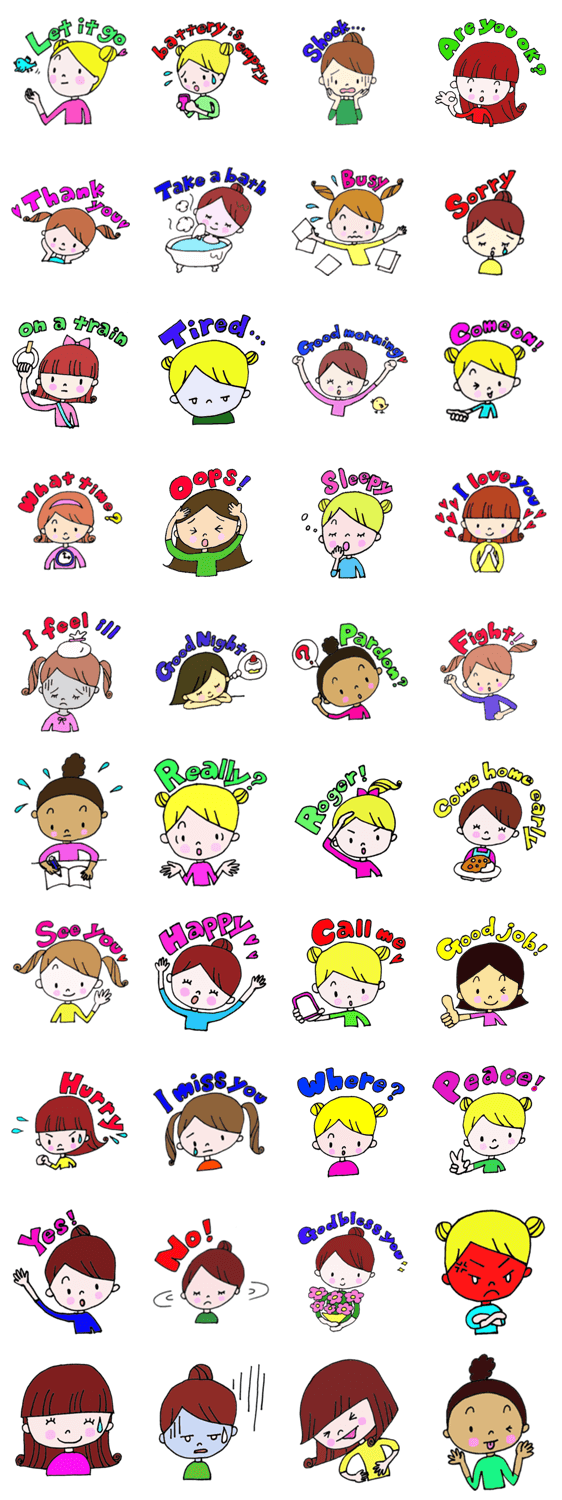 アンナとお友達のジェリービーンズの仲間たちは、毎日とってもわくわくしています。そんな楽しい生活をスタンプにしました!セリフは、英語表記です。