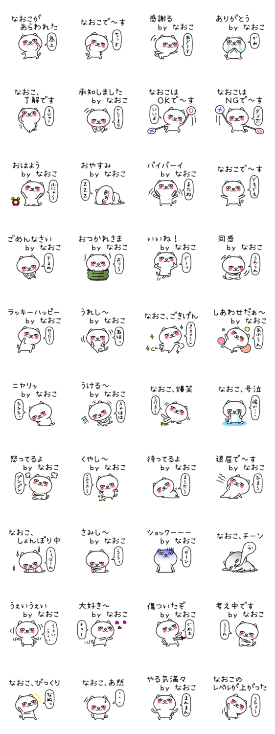 尚子、直子、奈緒子、菜緒子、奈保子、全国の「ナオコ」さん専用の猫キャラ名前スタンプ、日常会話の基本セットです。友だちとお揃いで使える「ちゃんねこシリーズ」です。