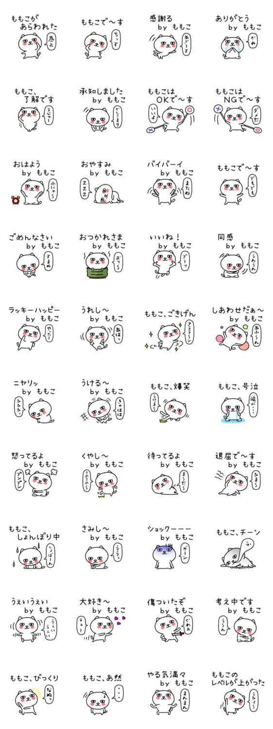 桃子、百子、杏子、もも子…、全国の「モモコ」さん専用の猫キャラ名前スタンプ、日常会話の基本セットです。友だちとお揃いで使える「ちゃんねこシリーズ」です。