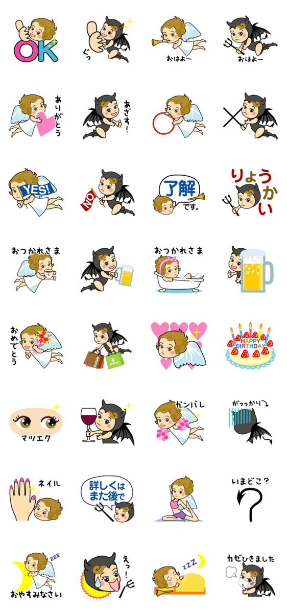 | スタンプ説明 | かわいい天使と悪魔のスタンプ。グラフィックデザイナーKEN作です。 |