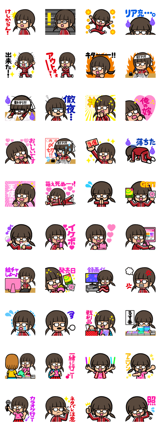 アニメ、漫画、ゲームが大好きなオタク女子「ふじ代ちゃん」のスタンプ。
