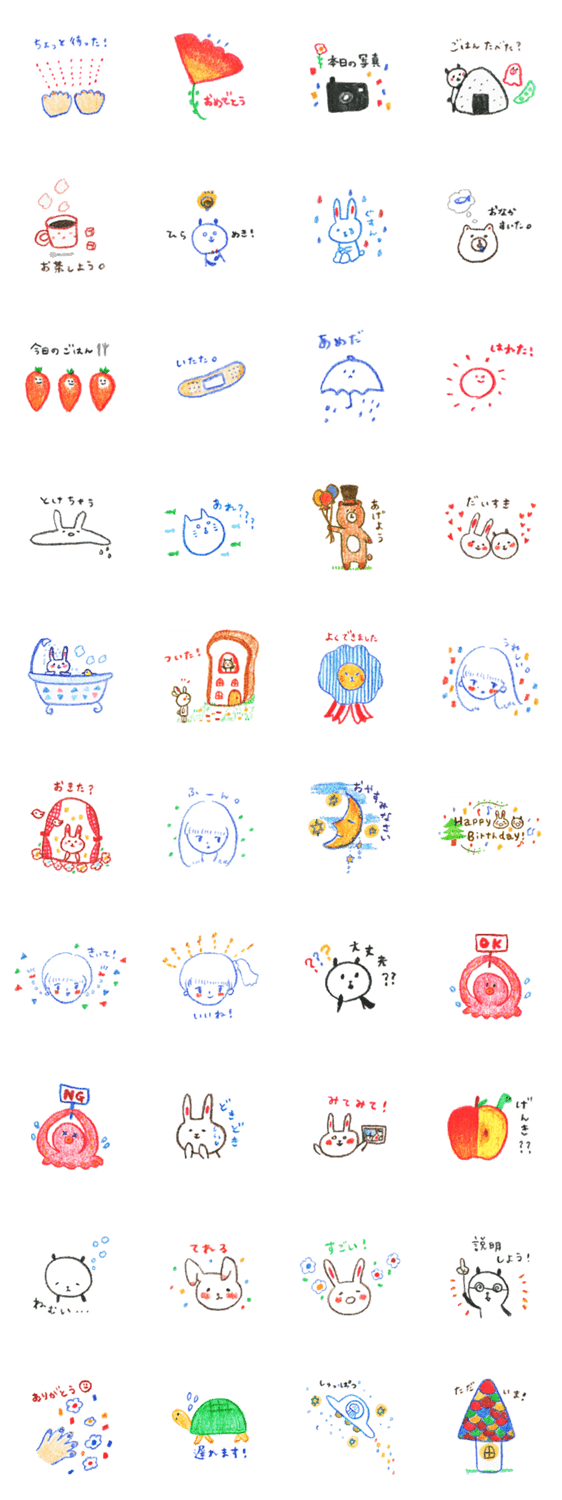 色鉛筆で素朴なスタンプを作ってみました。友達、恋人、家族、いろんな人とのコミュニケーションに。カラフルなスタンプたちが、あなたの毎日に彩りを添えます。