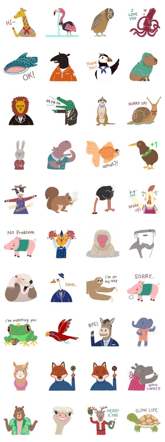 This is a sticker set for animal lover in crayon style with various species of animals such as Capybara,Tapir,Giraffe,Meerkat,Lion,Sloth,Kiwi,Bear,Fox,Rabbit!