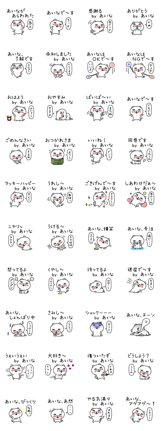 藍那、愛名、愛菜、愛那…、全国の「アイナ」さん専用の猫キャラ名前スタンプ、日常会話の基本セットです。友だちとお揃いで使える「ちゃんねこシリーズ」です。