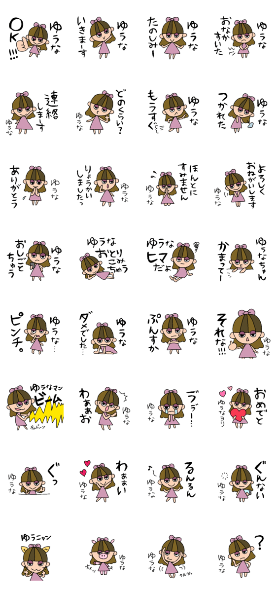 | スタンプ説明 | 全国のゆうなちゃんにおくる、ユウナ専用スタンプ! おちかくのゆうなちゃんへのプレゼントにも♪ |