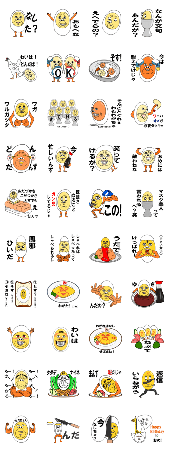 | スタンプ説明 | 津軽弁を話すゆで卵です。青森県を知ってもらえればいいなと思いつくりました。卵好き、方言が好きな方必見。 |