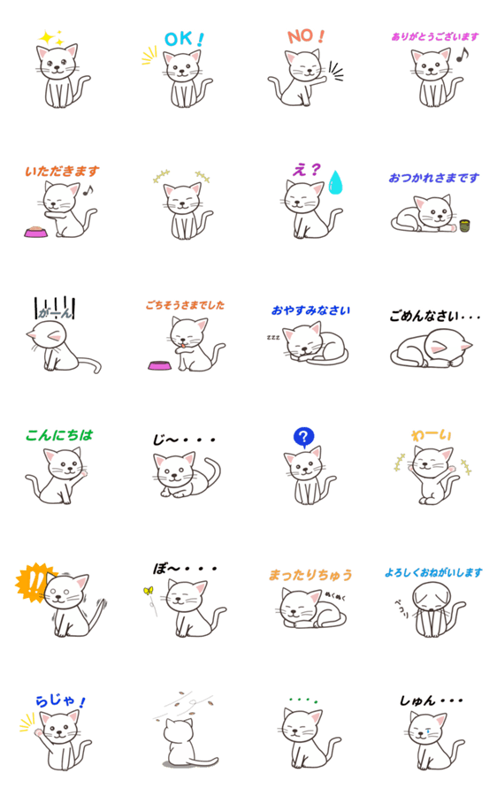 素朴なネコのゆるっとした姿を描く。その姿は「挨拶」「笑い」「涙」「しょんぼり」など、様々。