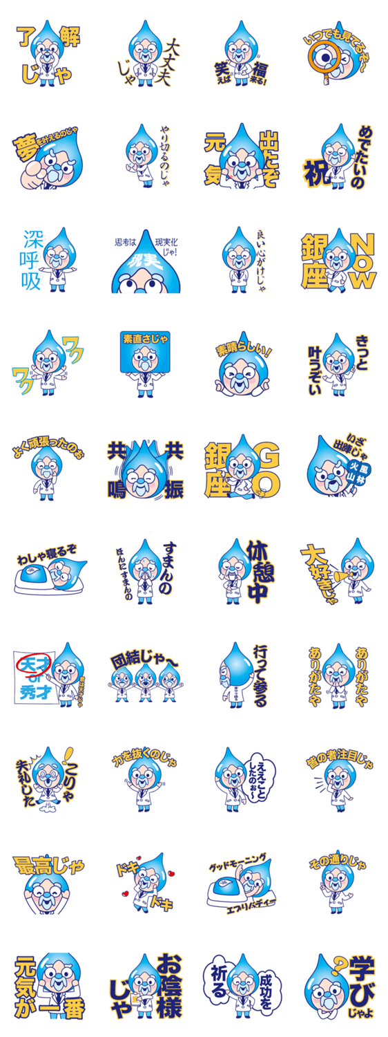 お水の国からやってきた、優しく前向きなお水の博士。お友達同士の会話でも、お仕事の会話でも、お気軽に使っていただけます♪銀座が好き♪