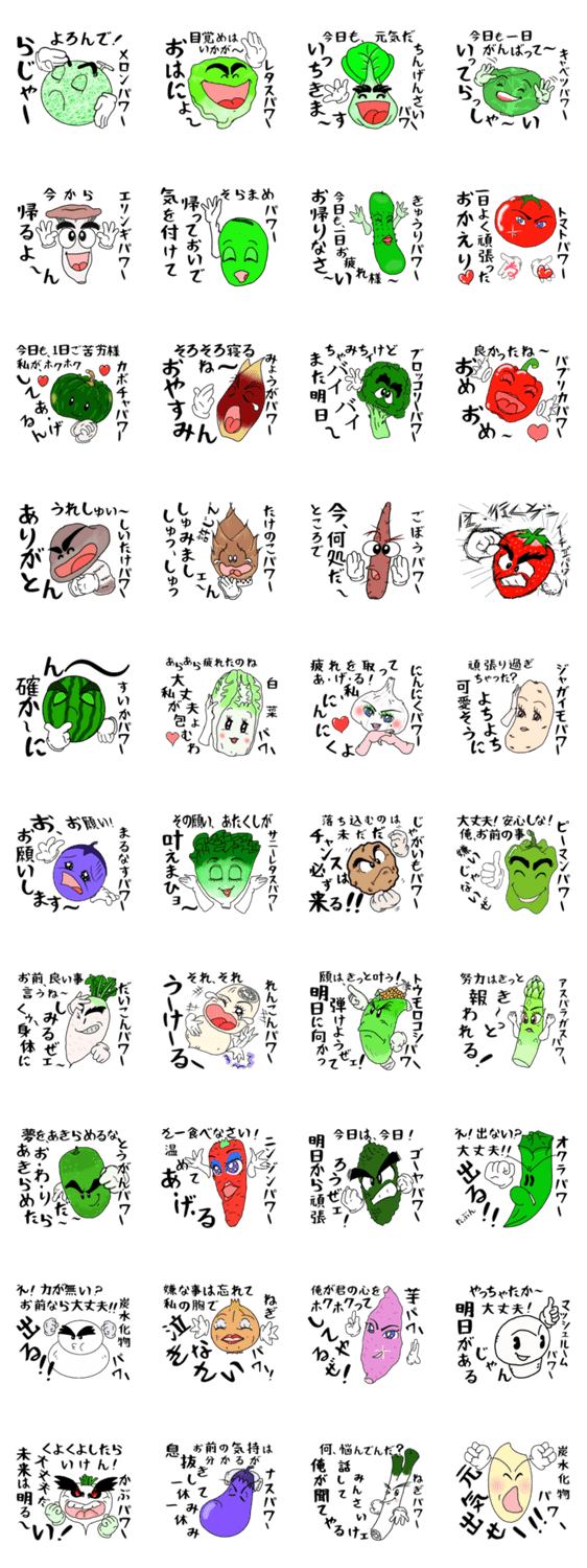 | スタンプ説明 | 野菜をキャラクターにして、褒めたり癒したり挨拶したり楽しいスタンプにしました。 |