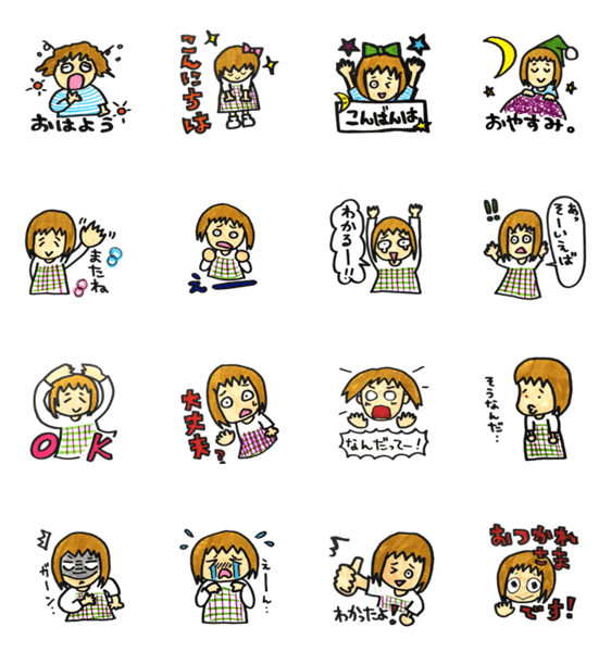うちの娘をモデルにスタンプを作りました。 いろんな表情の女の子とよく使う言葉で作りました!