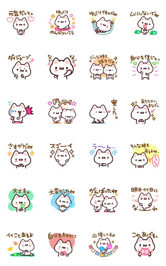 励ます猫のかわいいスタンプ登場!白猫ニャンコが、疲れた人を癒すハートフルなスタンプです!白いネコで大好きな友達・彼氏・彼女・家族を癒してあげてね。