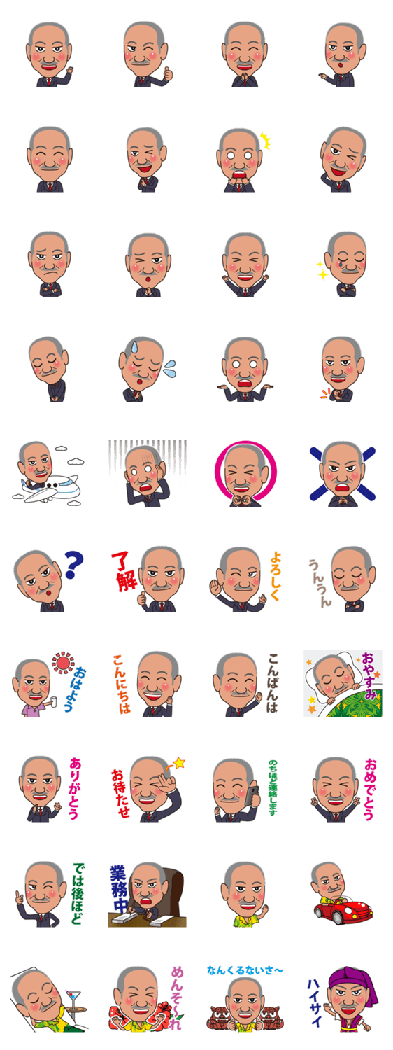 | スタンプ説明 | 西へ東へ大活躍、しばやま会長の日常をスタンプにしました。 |