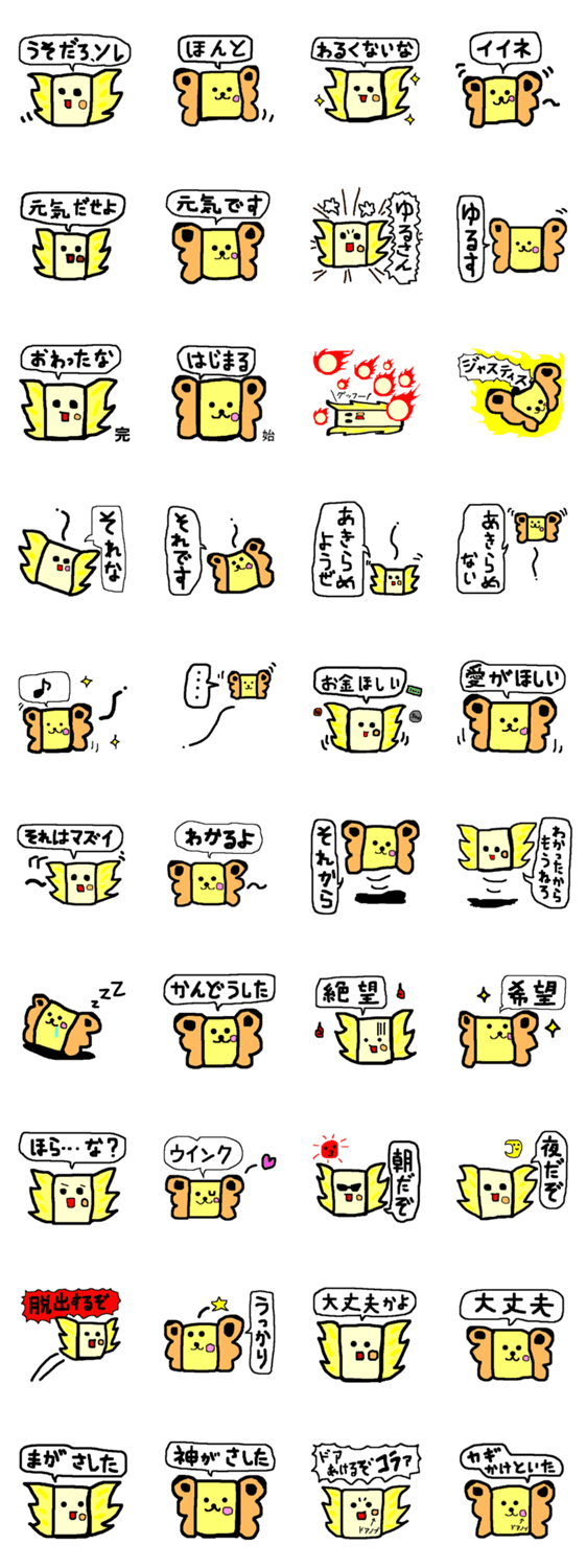 | スタンプ説明 | 新種発見!ドアコウモリとドアチョウのシュールな世界をご堪能くださいませ。吹き出しのメッセージが普段の会話で案外使えます。 |