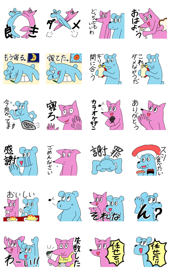 自堕落に生きるクマ男とキツ美のスタンプ。ギリギリで生きているあなたにおすすめ。