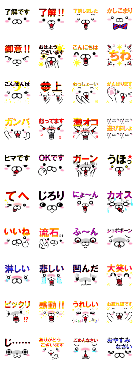 デカ文字で日常会話やメッセージ、オノマトペ系を伝えます。あとデカ顔がリアクションしています。顔の鼻の辺りや手などには色を付けていないので、背景の色になります。