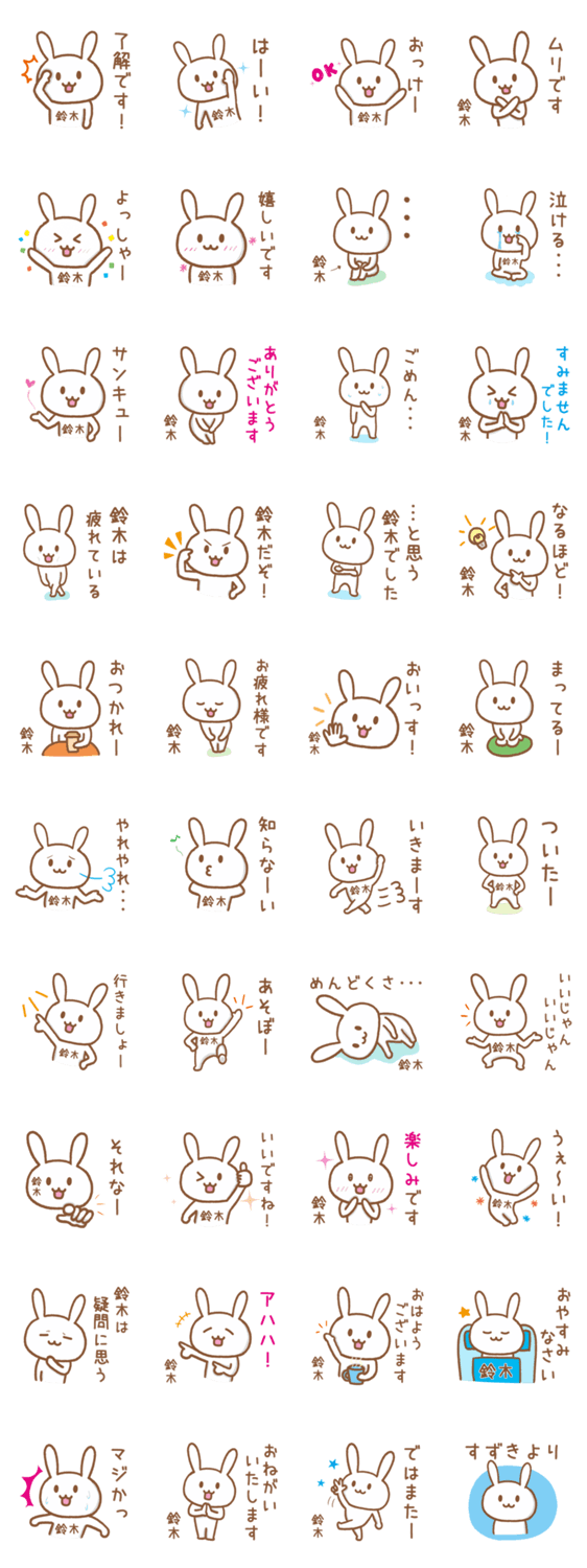 苗字(名字)が鈴木(すずき)の方が使えるうさぎです。よく使う言葉を集めました。名前が鈴木の人へのプレゼントにもぜひ。
