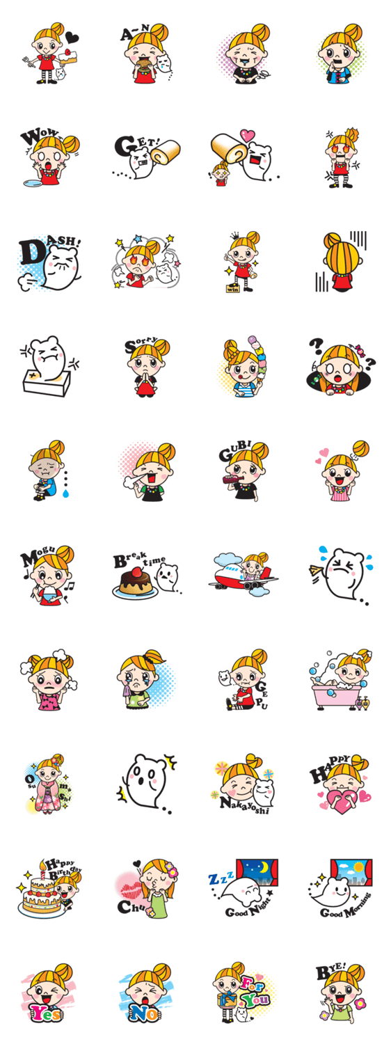 おだんご頭のオシャレな女の子ぽっことかわいい謎の生物ぷぅのほのぼのLIFEを描いた日常会話スタンプ。