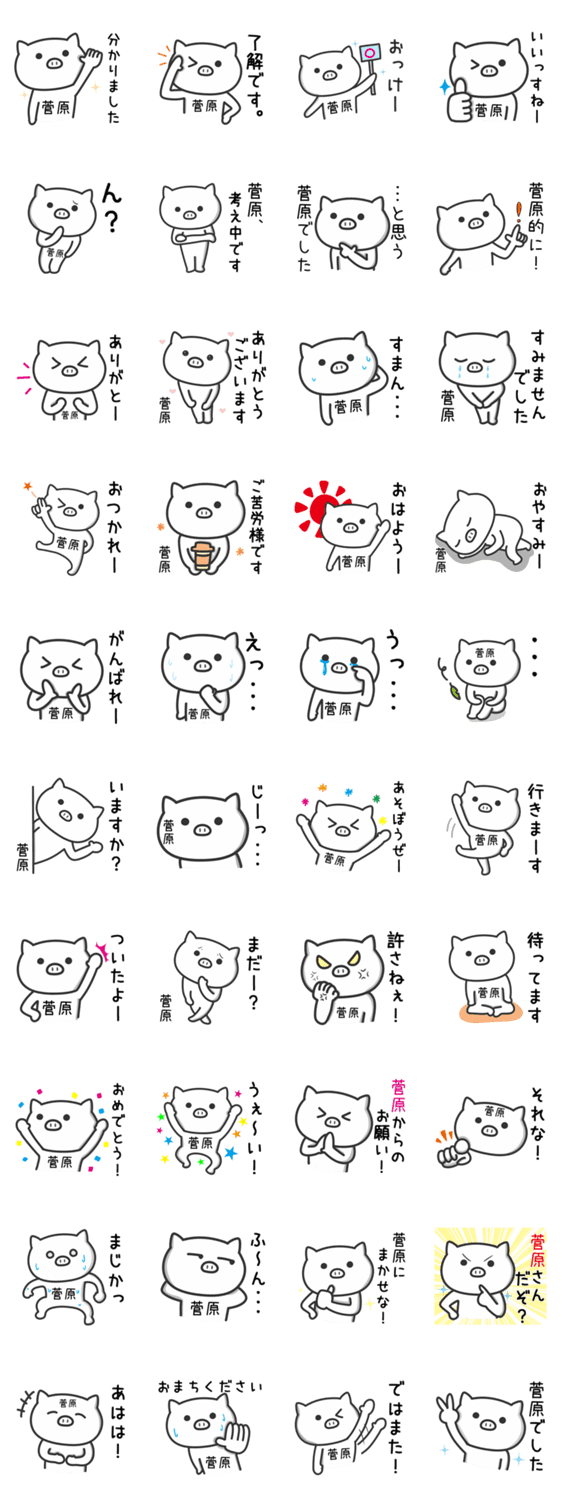 苗字(名字)が菅原(すがわら)の方が使えるぶたのスタンプです。名前が菅原の人へのプレゼントにもぜひ。