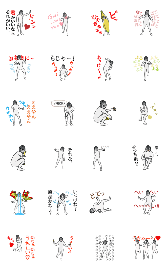 なんとなく レトロ? どことなく 昭和?な感じの 言葉が多めの、 ウホウホ 動く ごりら な スタンプ です。