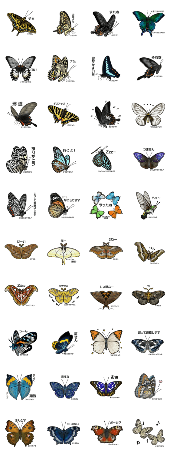 日本で見られる蝶と蛾のスタンプがついに登場!オオムラサキからヤママユまで、リアルかわいい蝶たちをトーク画面に舞わせましょう!昆虫・鱗翅目好き必見のスタンプです