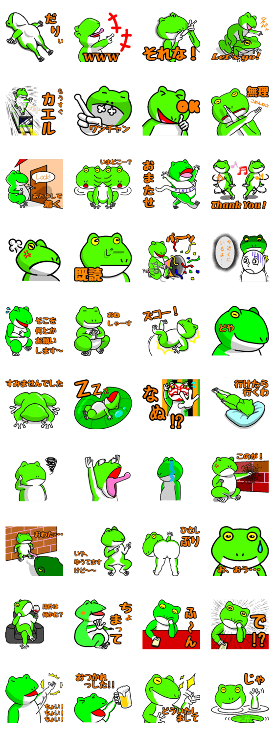 誰でも使えるスタンプです。カエルに気持ちや状況を代弁させましょう。
