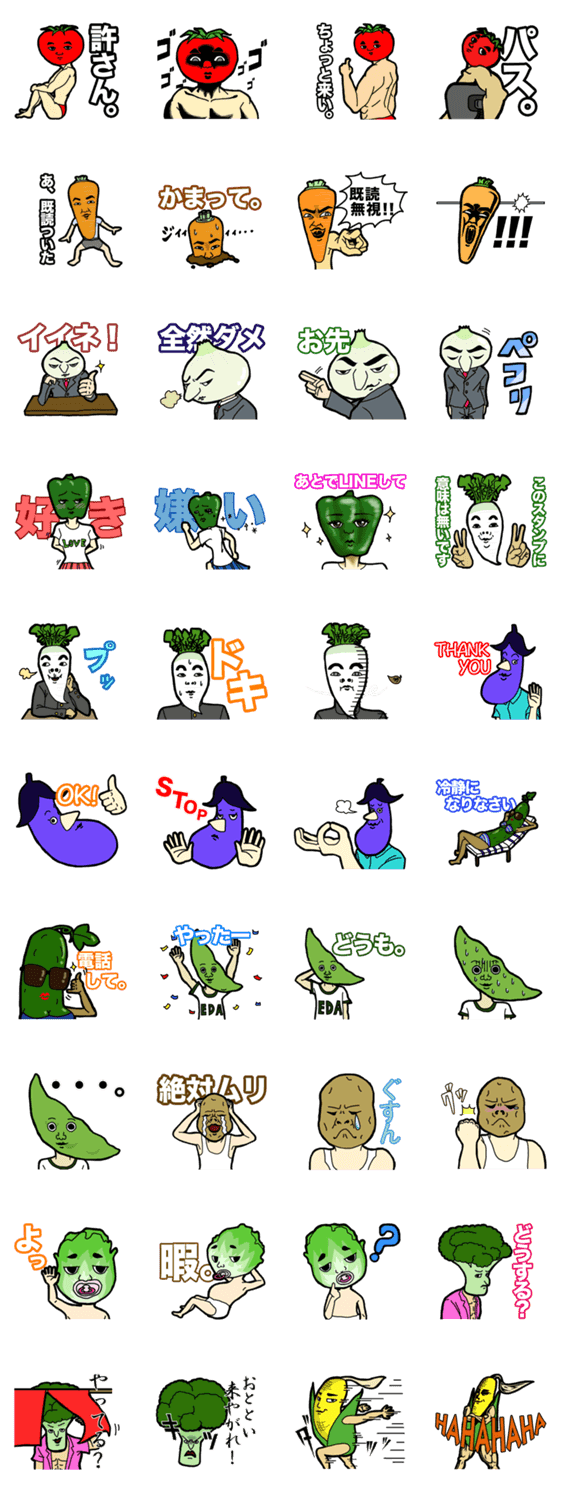 人間に憧れた野菜たちが進化を遂げて…!?個性あふれる可愛くて少し不細工なキャラクターたちがあなたのLINEトークを盛り上げます!!