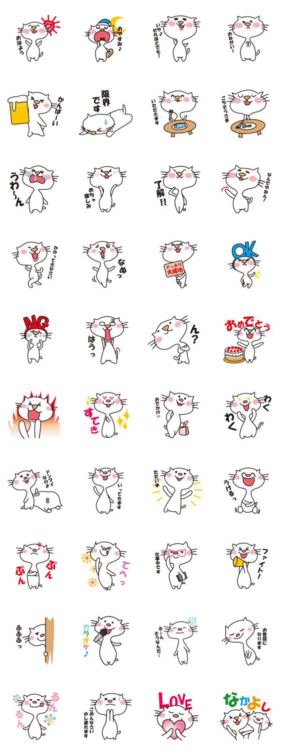 ゆるい白ねこ、姉のハナ(ピンクの鼻)と弟のユキ(茶色の鼻)の姉弟スタンプです。