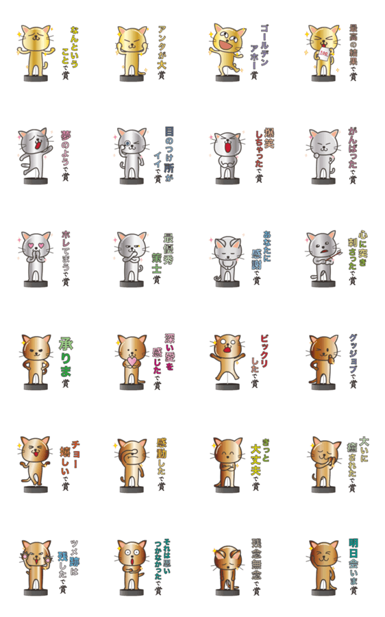 いろいろな「◯◯で賞」を揃えました。猫のトロフィーなので、キャットロフィーと言います。ゆっくり回ります。ゴールド4種類。シルバー8種類。ブロンズ12種類。です。