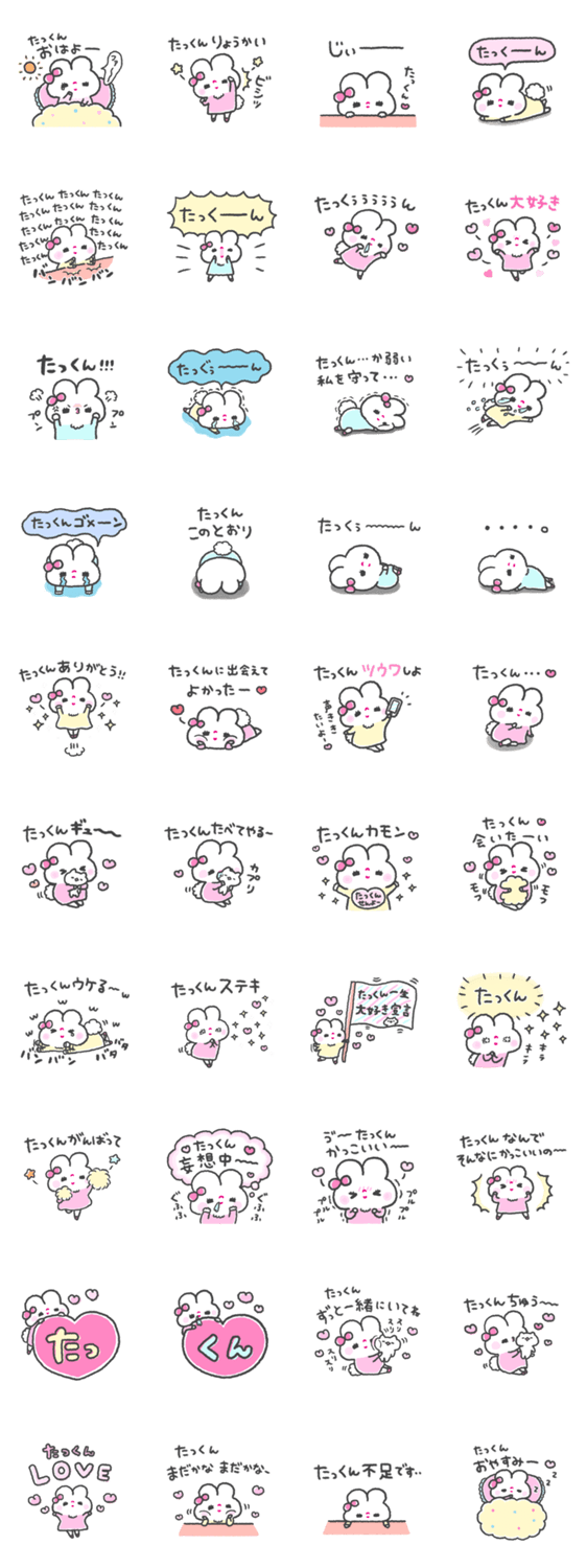 | スタンプ説明 | 「たっくん」に送るうさぎちゃんスタンプです♡たくや、たかし、たくみ、たいち、たいし、たつや、たくま、など大好きな「たっくん」に是非♡ |