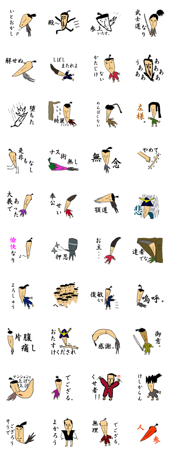 スタンプ第七弾!顎長男の武士道。それは剣を極め、ただひたすらに尖らせること。それが彼の武士道なり。シュールでもあり、ゆるさもある。そんな侍(武士)のスタンプです