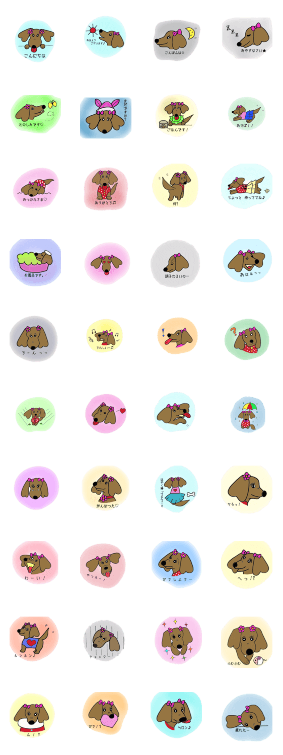 リボンとお洋服が大好きなダックスフンドの「レディちゃん」。 とっても可愛い、おしゃれが大好きなダックスフンドのスタンプを作りました。